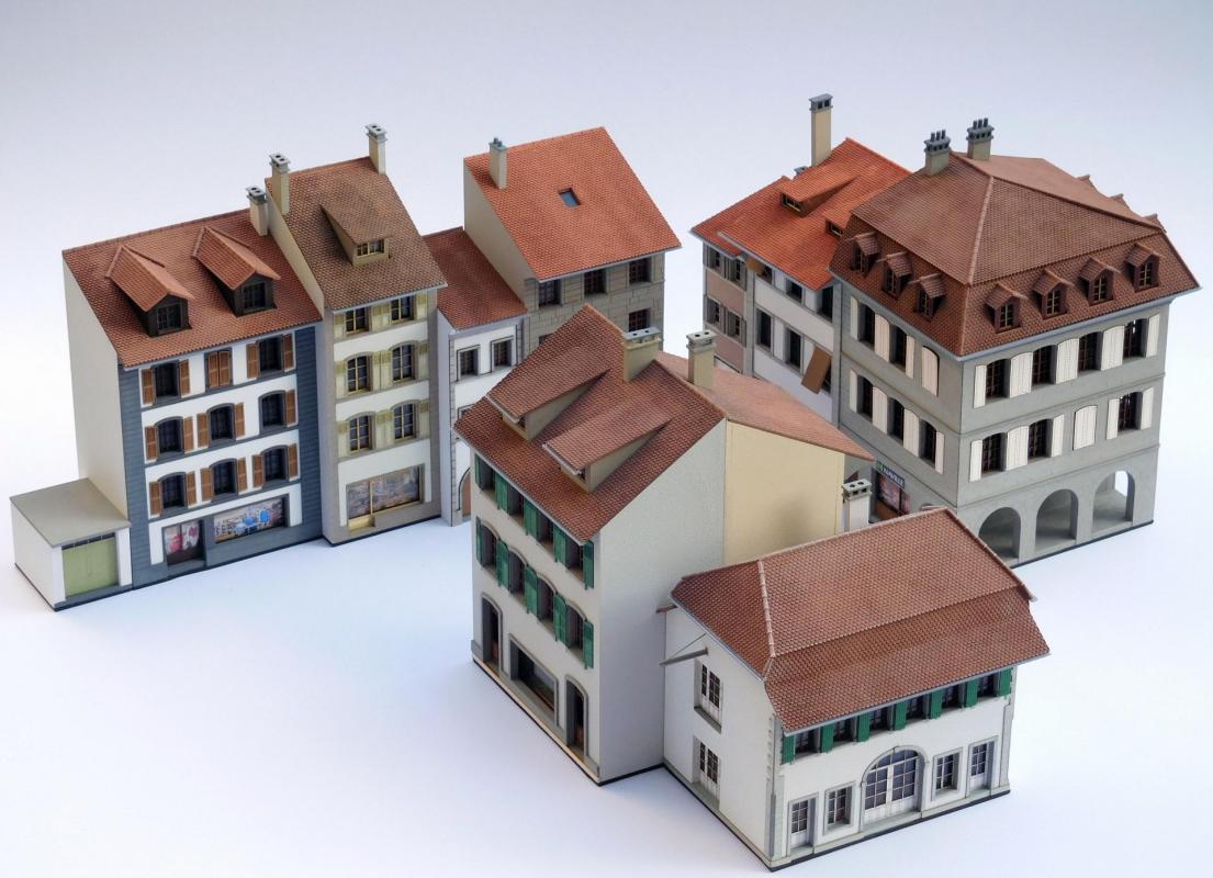 Les bâtiments M/100 et M/170 ont 3 faces décorées, ils permettent de terminer les rues, les autres ont 1 faces décorées et se montent en ligne ou dos à dos.