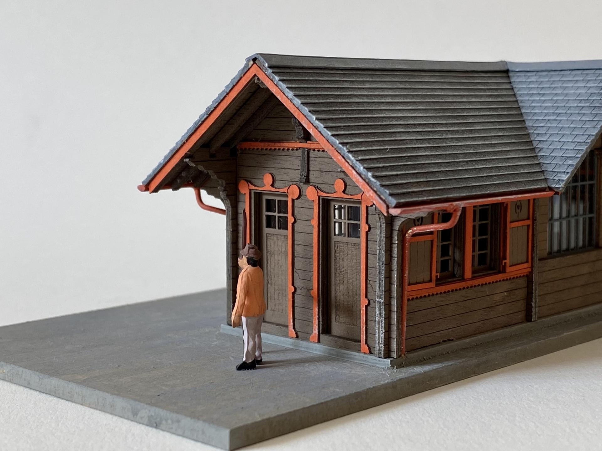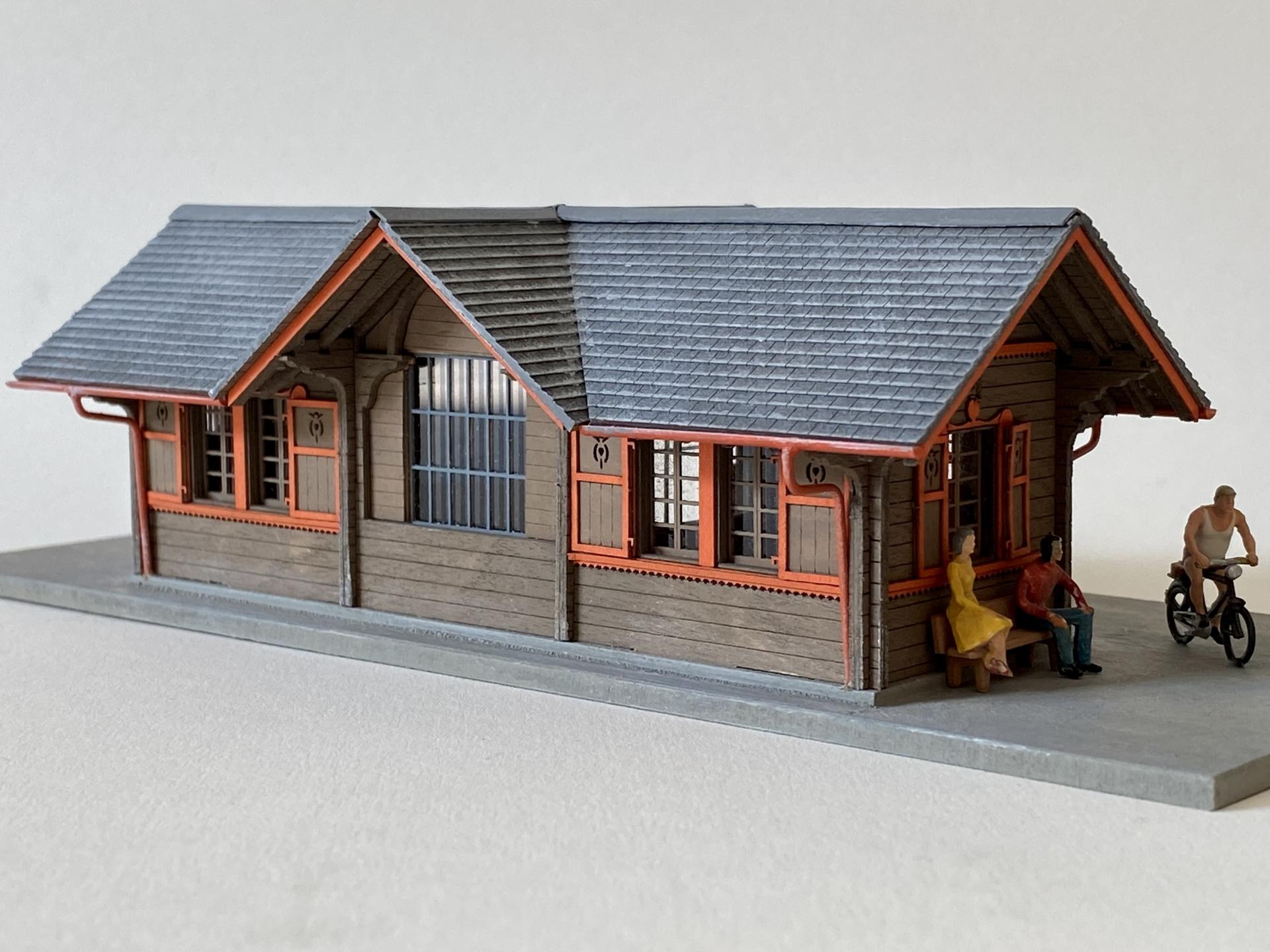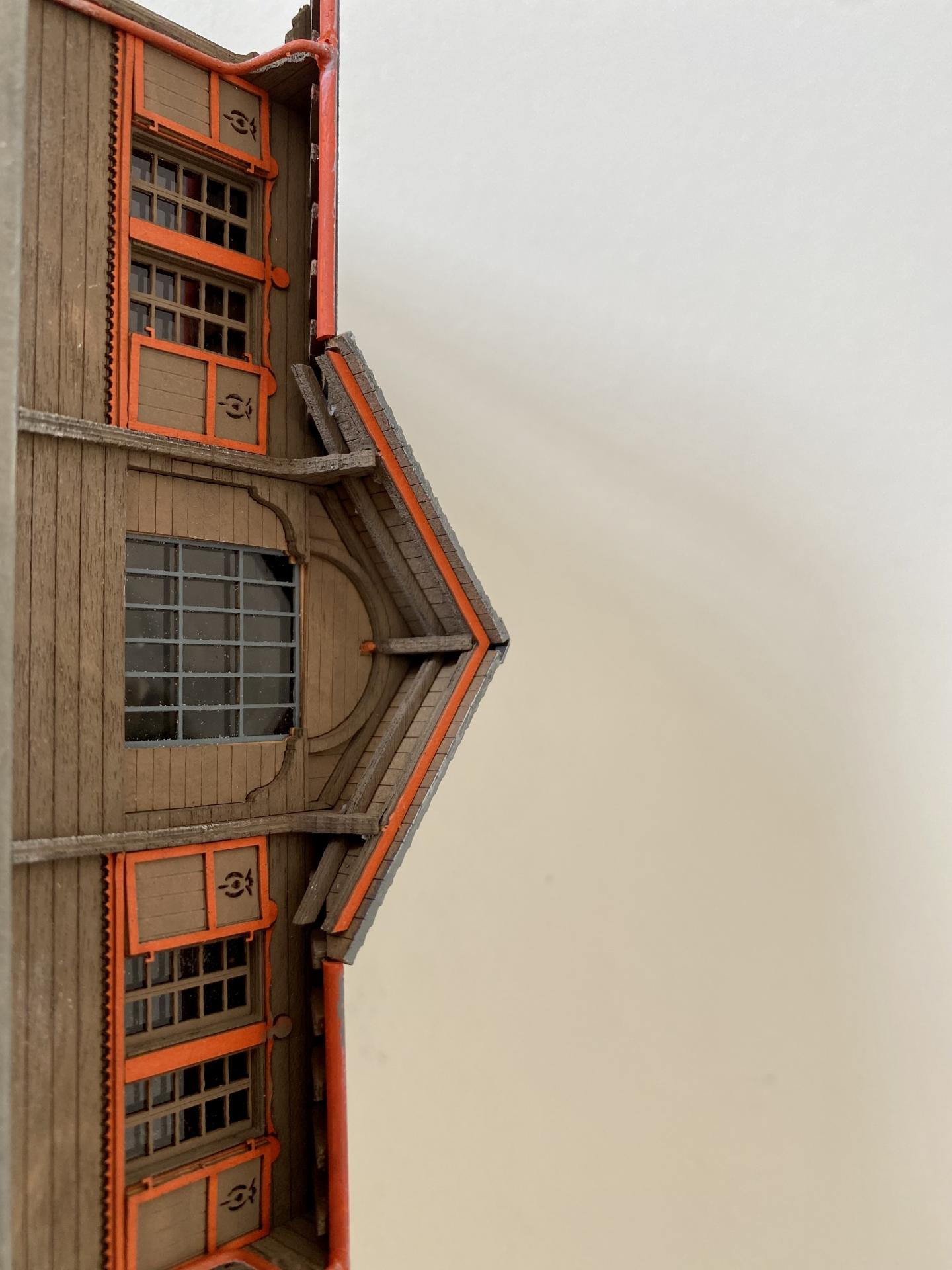 Les façades sont en bois, la toiture finement gravée.