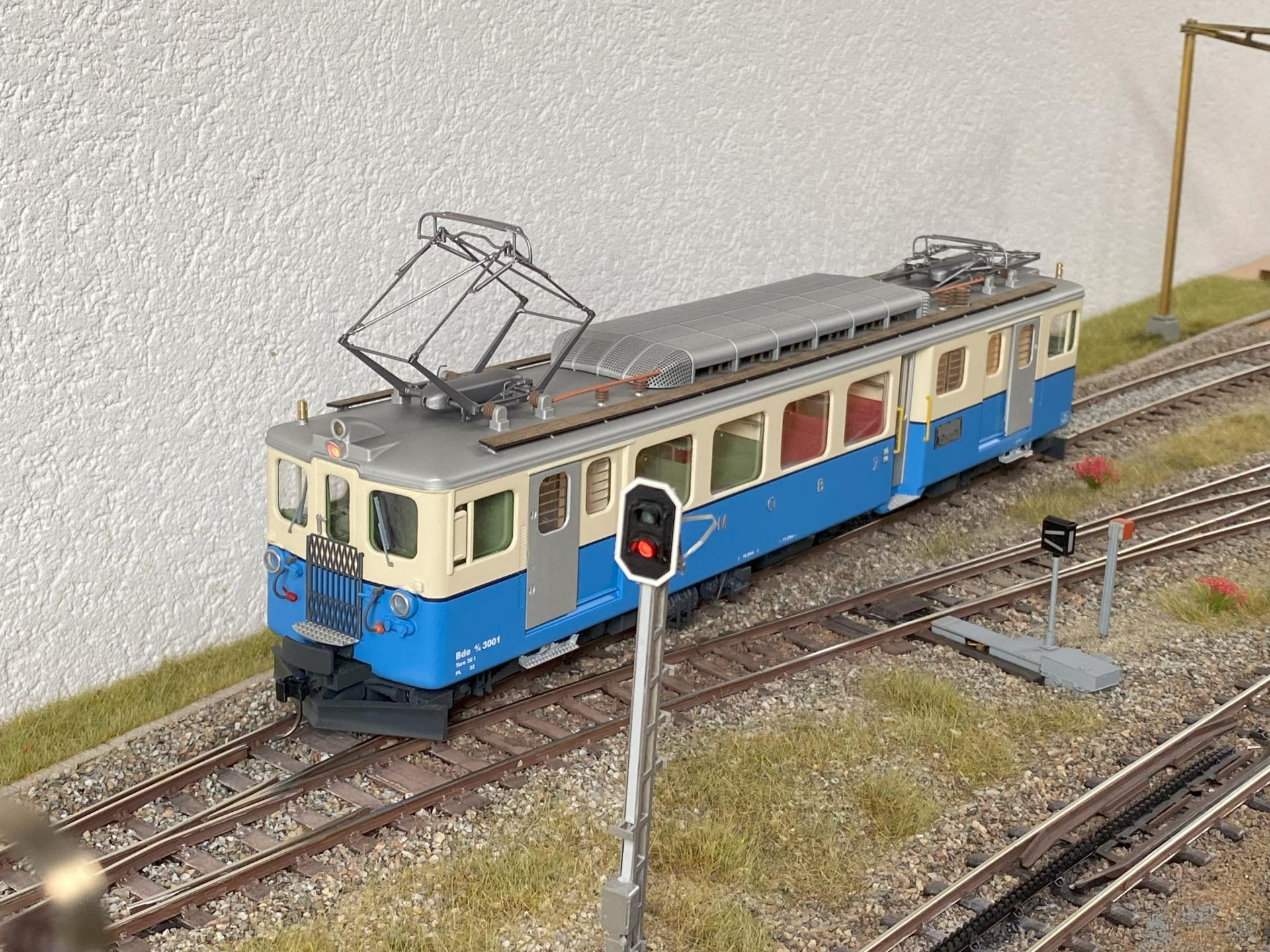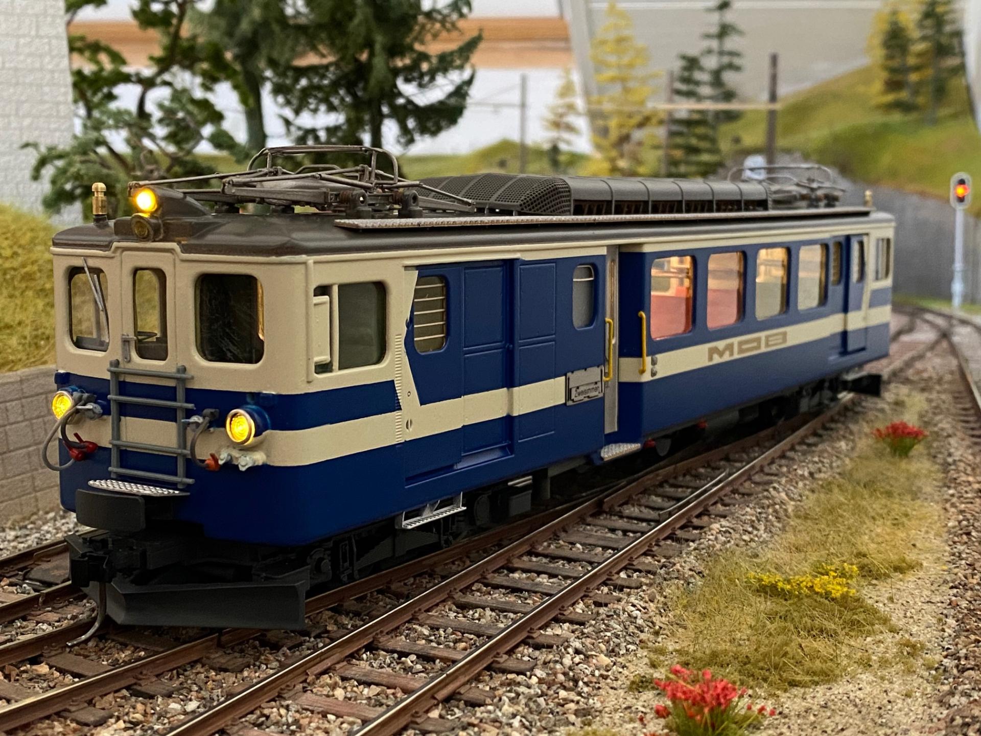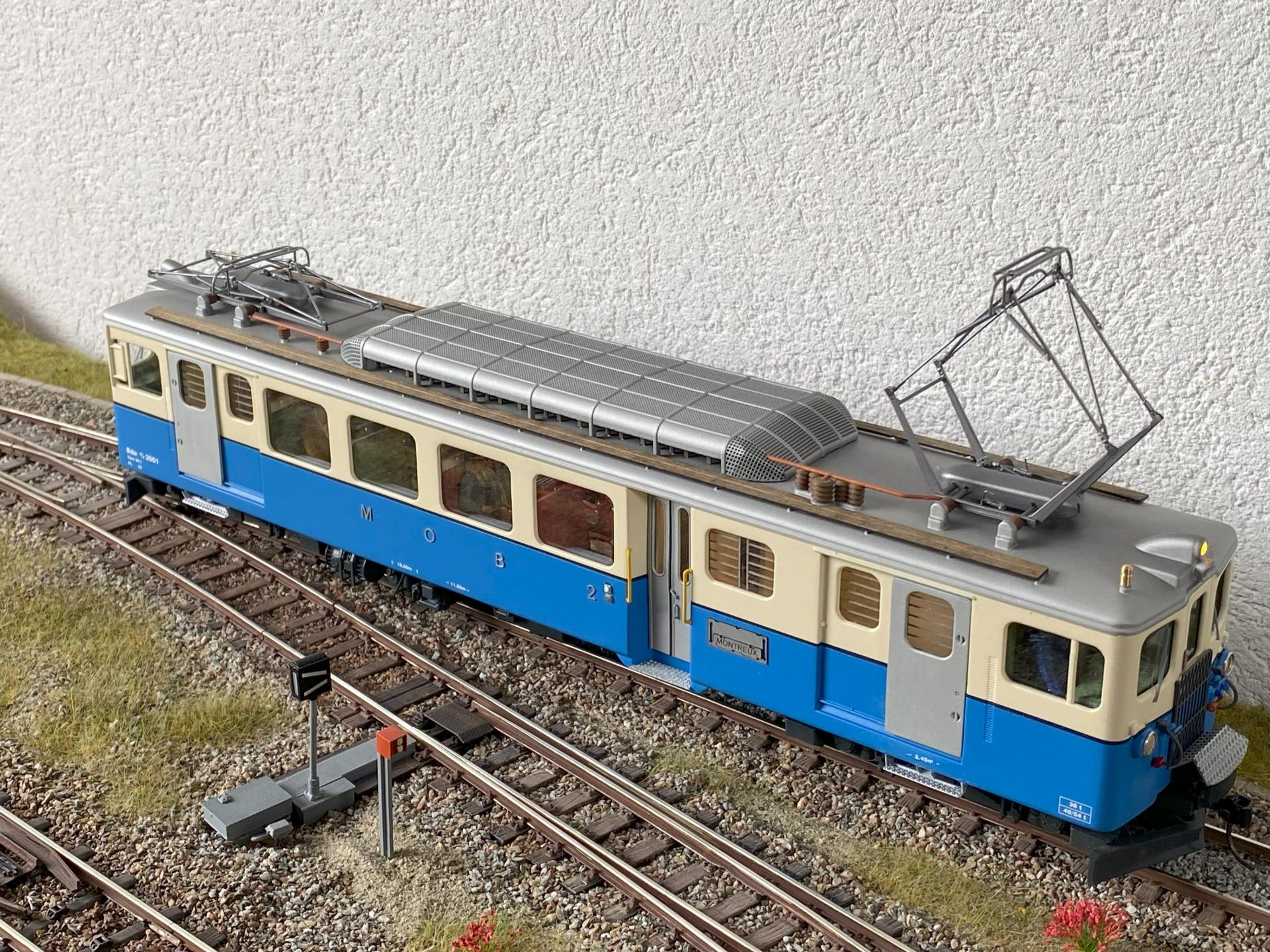 Nachbildung des Triebwagens BDe 4/4 3001 der Gesellschaft Montreux-Oberland-Bernois, (Originallackierung), und der Panoramaversion 3003.