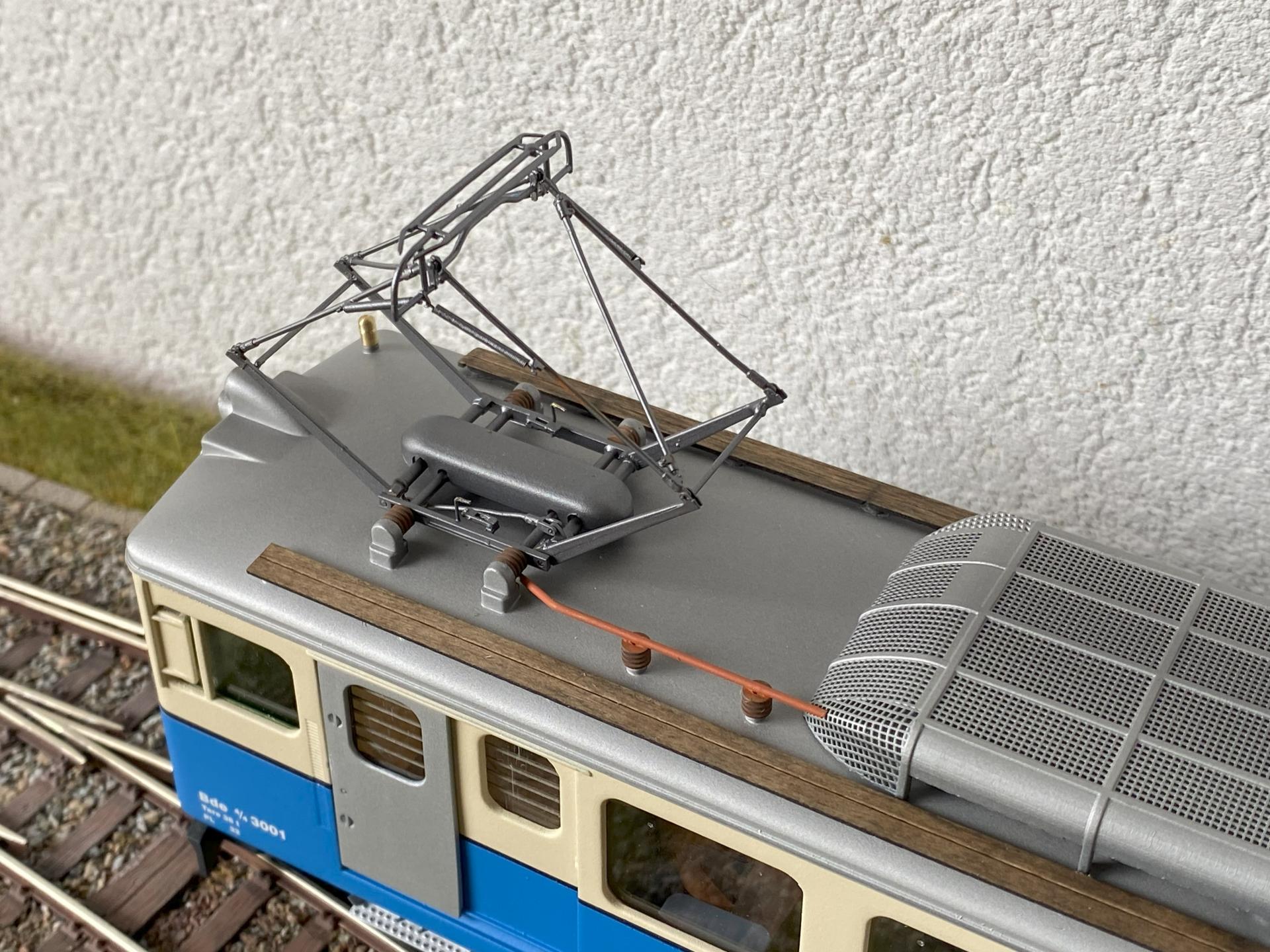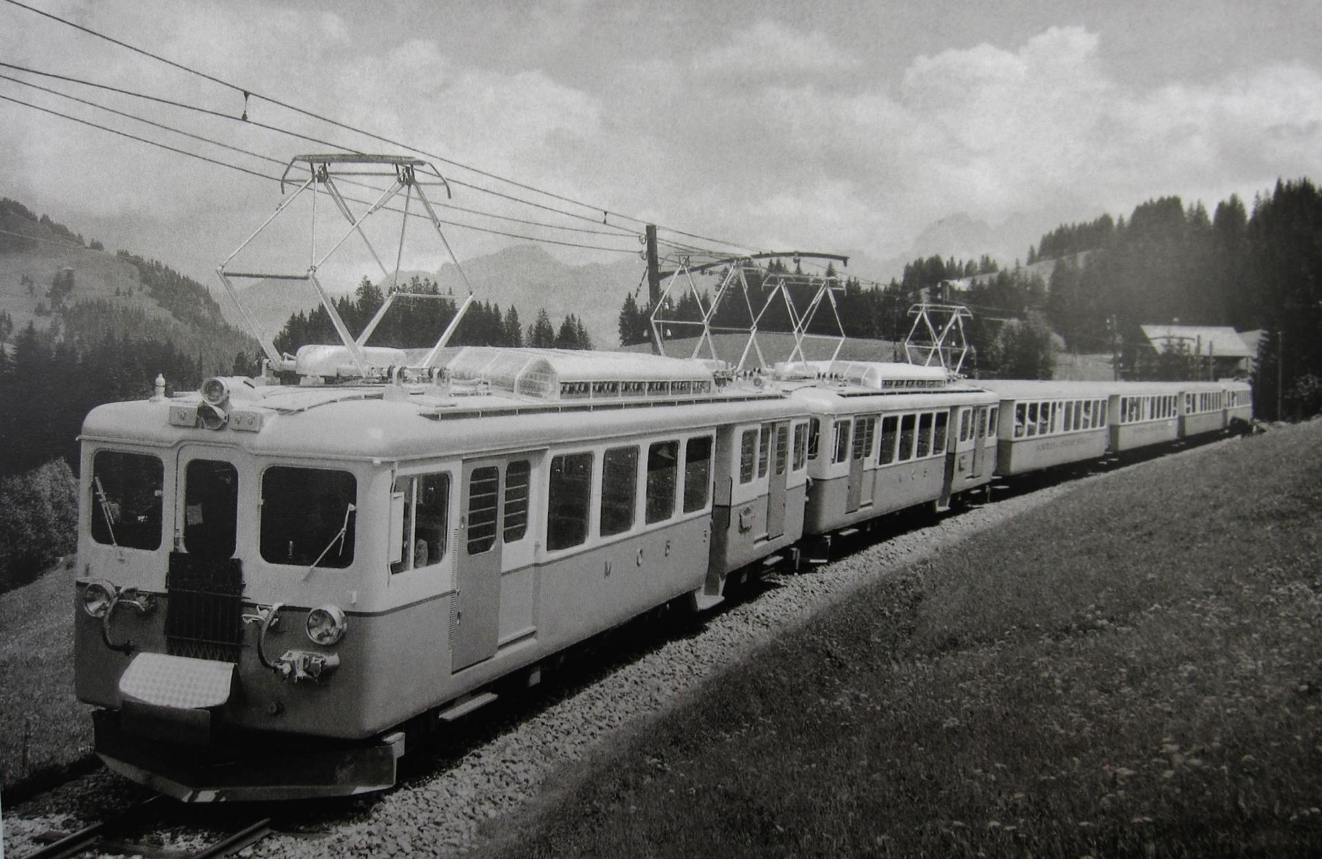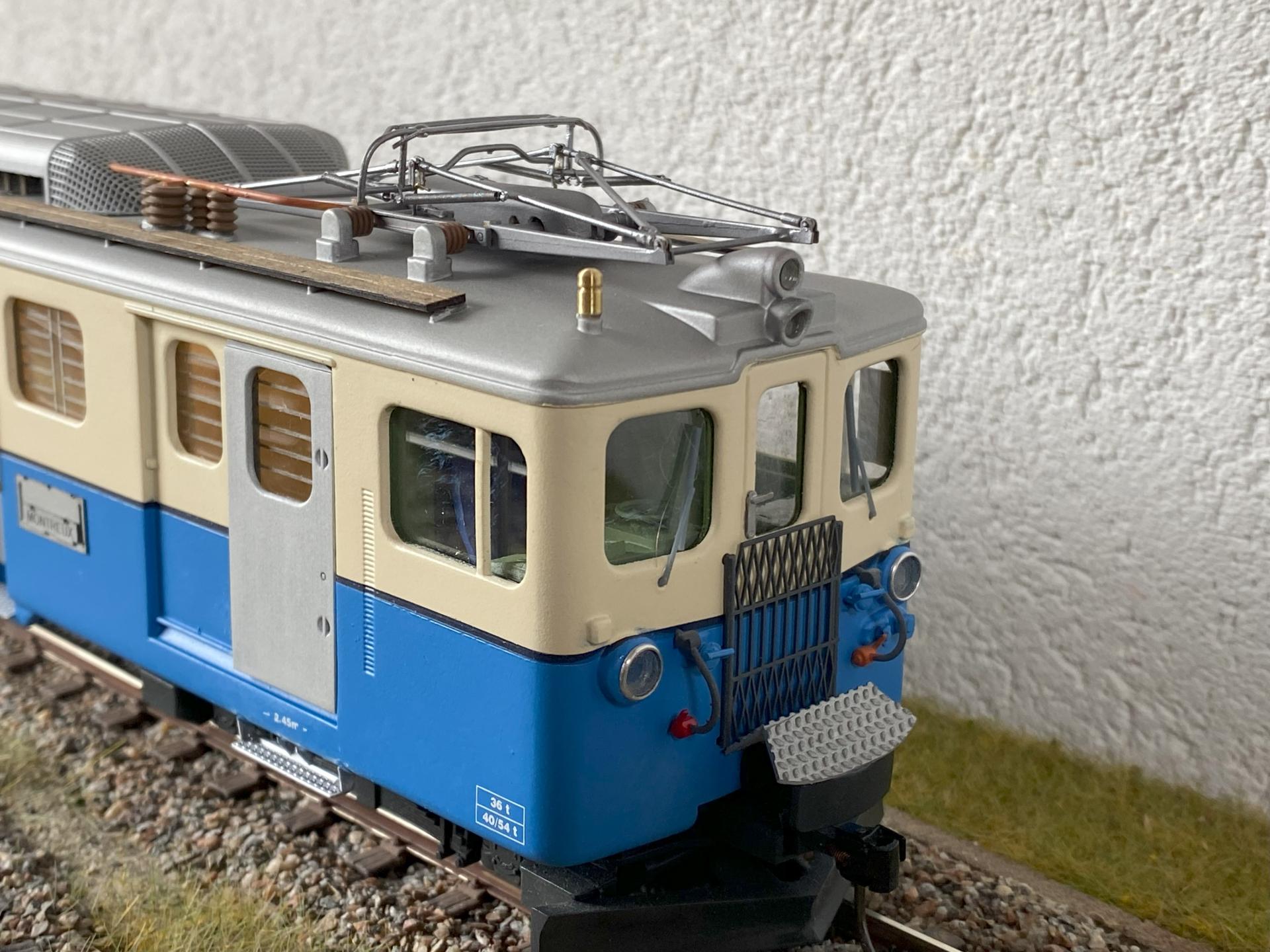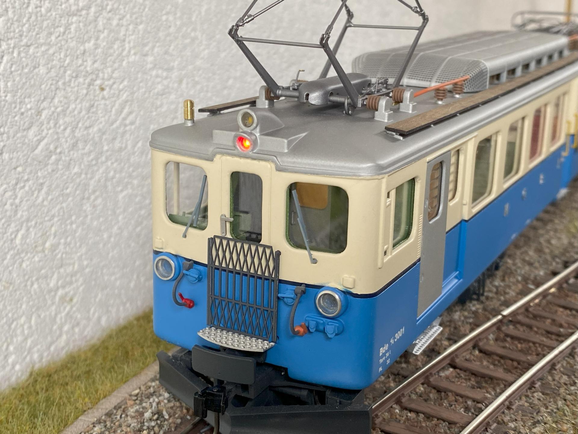 Nachbildung des Triebwagens BDe 4/4 3001 der Gesellschaft Montreux-Oberland-Bernois, (Originallackierung), und der Panoramaversion 3003.